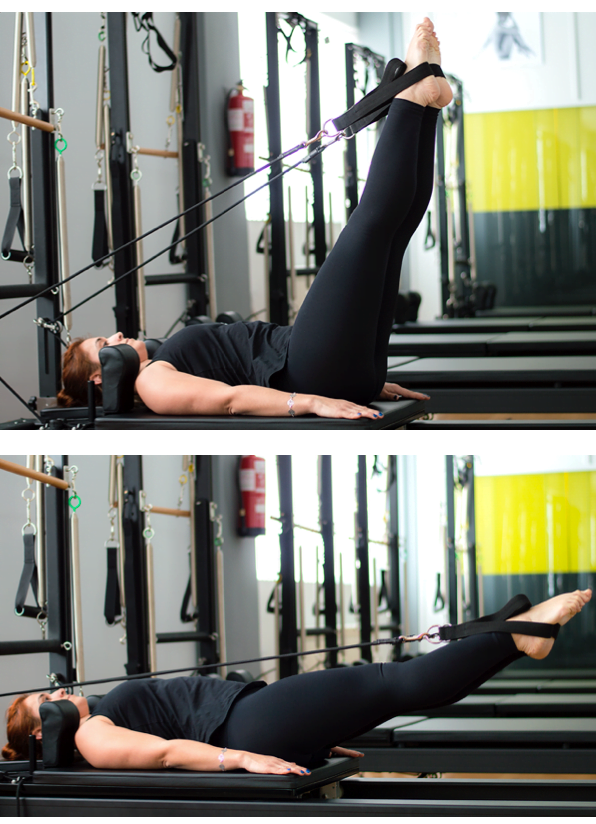 Decúbito supino, piernas en Table Top, correas en pies, brazos extendidos a lo largo del cuerpo.